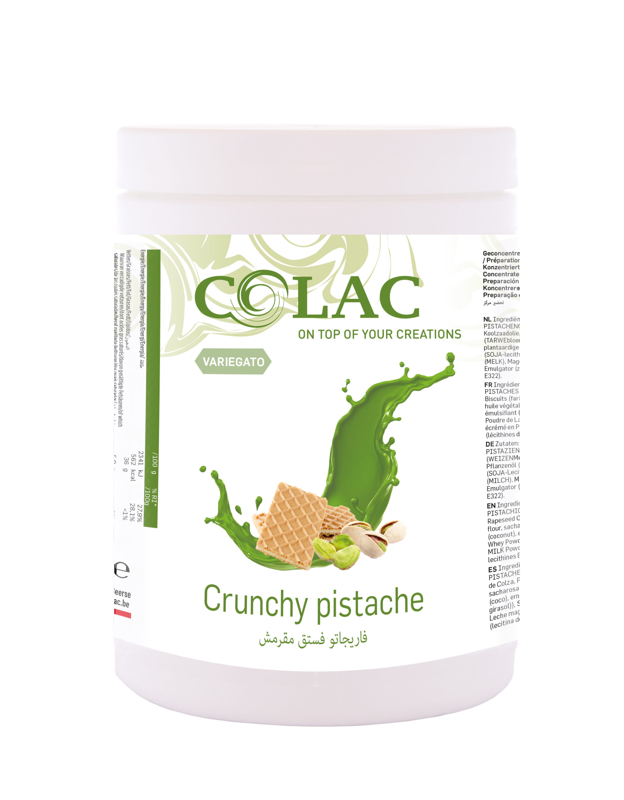 Sakkarose, PISTACIE NØDDER (27%), rapsolie, kiks (HVEDEMEL, sakkarose, vegetabilsk olie (kokos), emulgator (SOJA lecithin), VALLE PULVER, SKUMMETMÆLKS PULVER, emulgator (E322).Ingredienser i henhold til (1169/2011/EU)