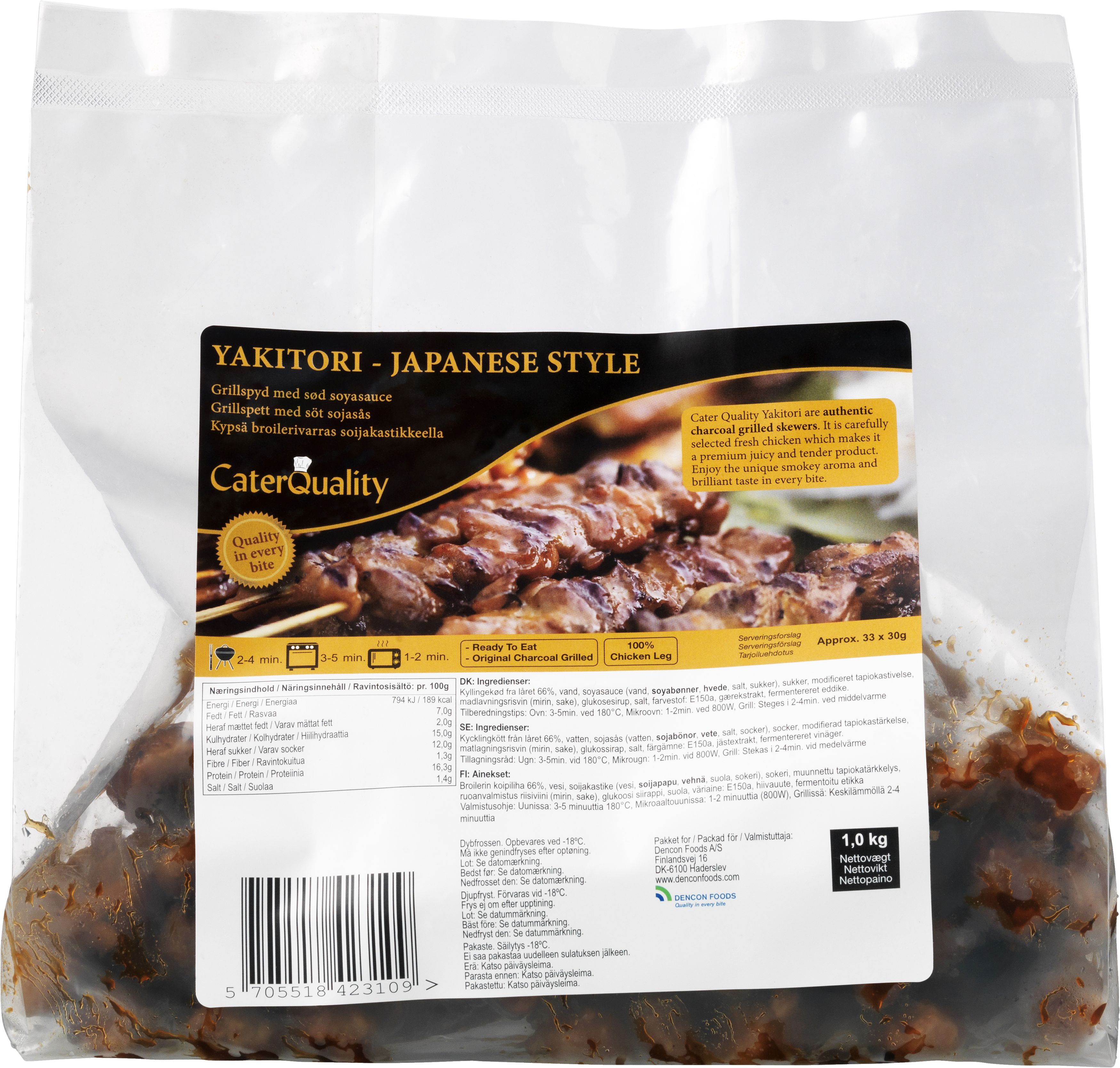 Opbevares ved -18°C. Cater Quality Yakitori spyd Må ikke genindfryses efter optøning. 3-5 min. ved 180°C. Cater Quality er en serie med kvalitetsvarer til kantiner, restauranter og caféer. Her finder du god kvalitet til den rigtige pris. Med Cater Quality, er du sikker på en god og ensartet kvalitet.