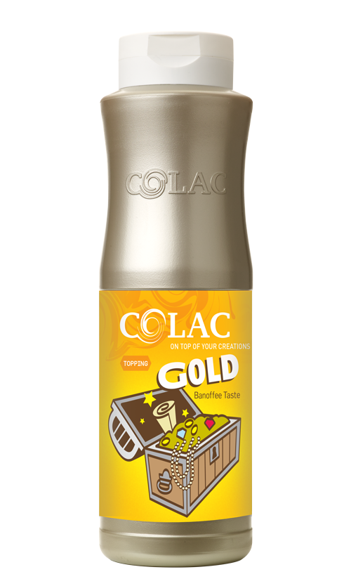 Topping, Gold – dessertsauce – uimodståelig smag af banan og caramel-toffee med et gyldent/glitterskær.